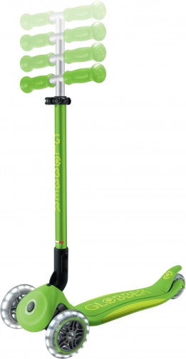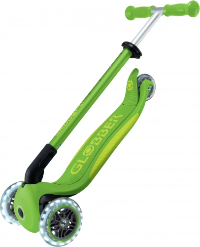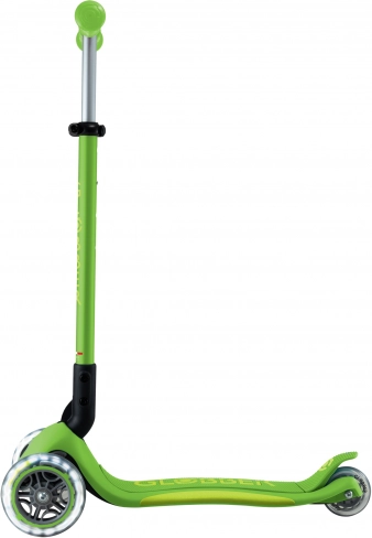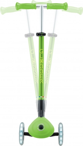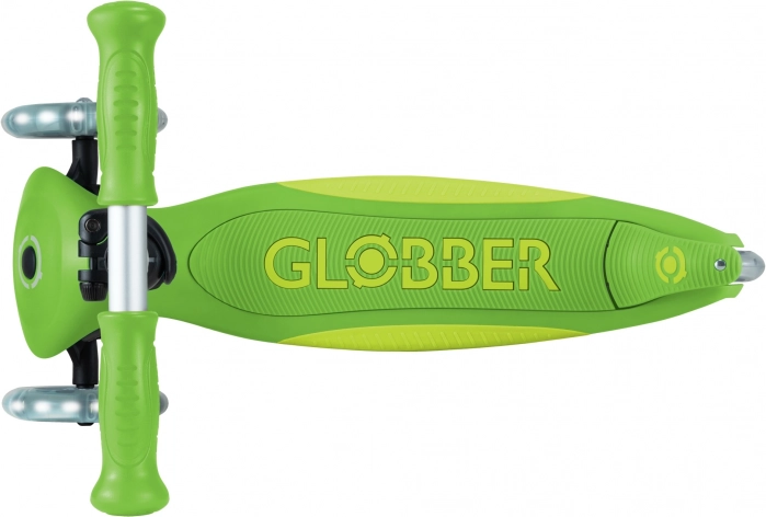 GLOBBER Primo Foldable Plus Lights skiller sig ud ved at kombinere stabilitet, sikkerhed og sjov. De to store forhjul på 120 mm med lysende LED-dioder drevet af dynamo fanger blikket og forbedrer synligheden. Den lave, brede platform med skridsikker overflade giver sikker fodstilling og nem kontrol for begyndere.