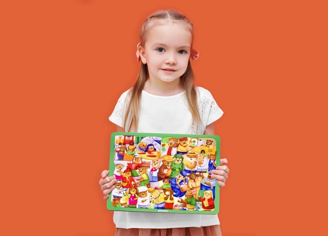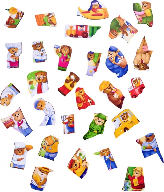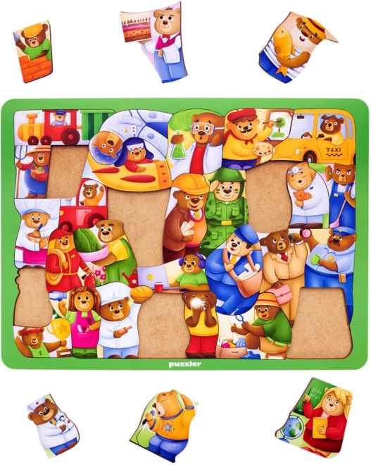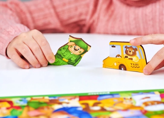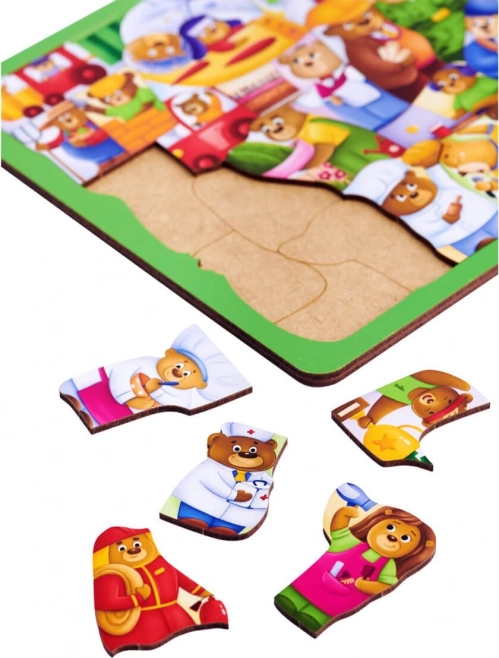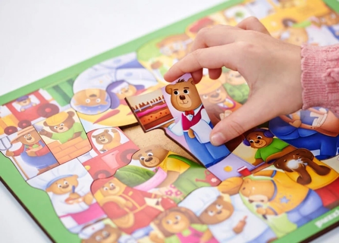 Træpuslespillet med bjørne introducerer børn til en verden af forskellige erhverv – fra redder og læge til musiker. Takket være de livlige illustrationer og den robuste udførelse i træ tilbyder det underholdning, der samtidig støtter udviklingen af vigtige færdigheder.