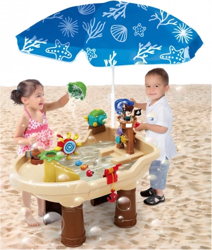 Oplev eventyr i haven med dette pirat-vandbord – et kreativt legetøj til børn, der kombinerer sandkasse, vandleg og en boblemaskine. Takket være vandkanonen, roterende hjul og snurrende dyr udvikles finmotorik, sanser og fantasi. Den holdbare plastkonstruktion, sikre afrundede kanter og mulighed for leg ude og inde garanterer masser af sjov året rundt.