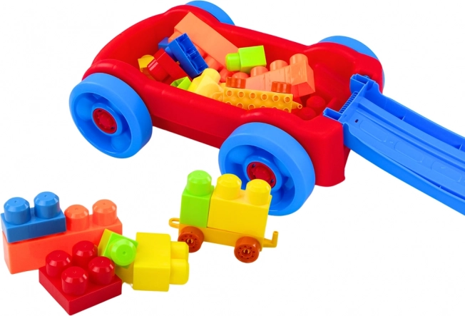 Dette legesæt kombinerer sjov og orden: den robuste plastvogn på fire hjul transporterer sikkert klodser og andre yndlingslegetøj. Takket være den lave vægt og det lange håndtag kan selv mindre børn nemt håndtere den, og det blå‑røde design fanger straks opmærksomheden.