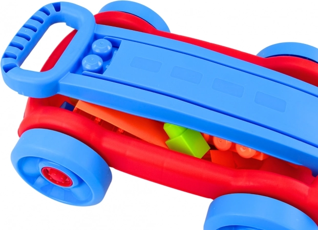 Sæt med byggeklodser i vogn på hjul blå‑rød