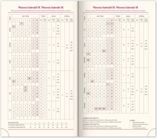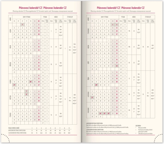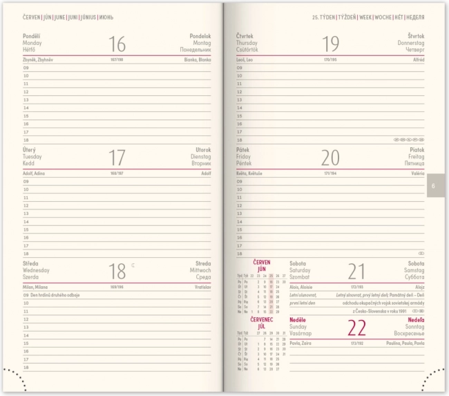 - Ugentlig tidsplan med tjekkisk-slovakisk kalender og ekstra sprog.