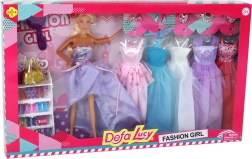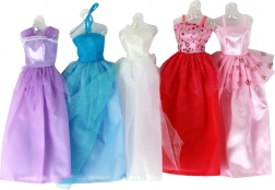 Sættet indeholder 5 stilfulde kjoler (hvid, lilla, mørkrosa, blå og lyserød) med tyl og glitrende detaljer. De er lette at tage på og opmuntrer til kreativ udklædning.