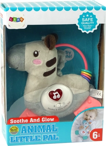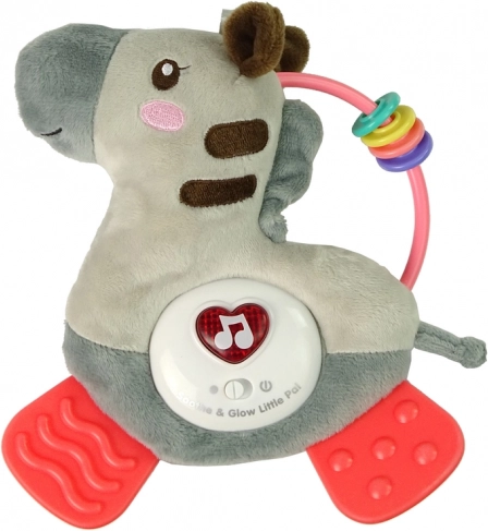 Den interaktive zebra i blød plys giver både underholdning og ro. Det lysende hjerte aktiverer melodier og fanger opmærksomheden, mens de bløde bideringe på benene lindrer ved tandfrembrud. Fire farvede ringe på ryggen fungerer som en rangle og udvikler greb og håndteringsevner.