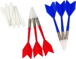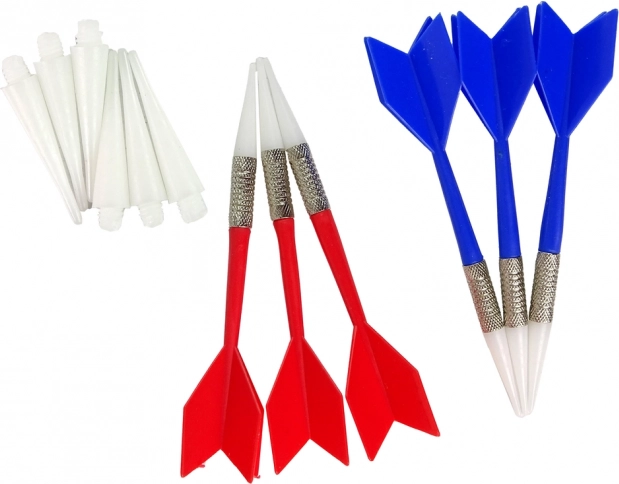 Sættet indeholder pile med plastikfjer og metalhåndtag for præcis kastning.