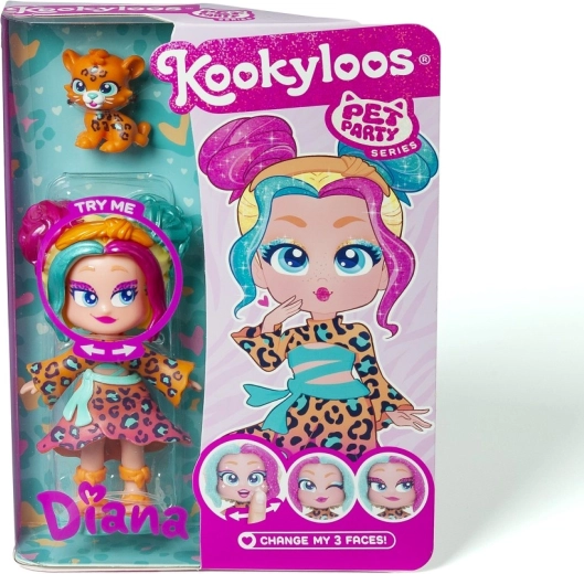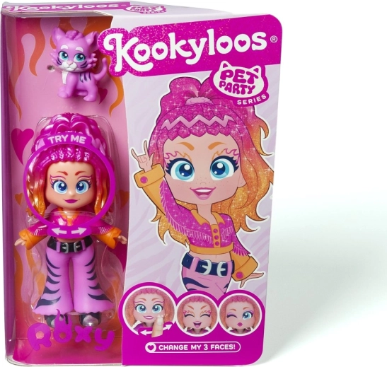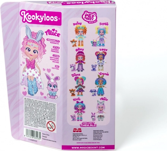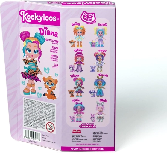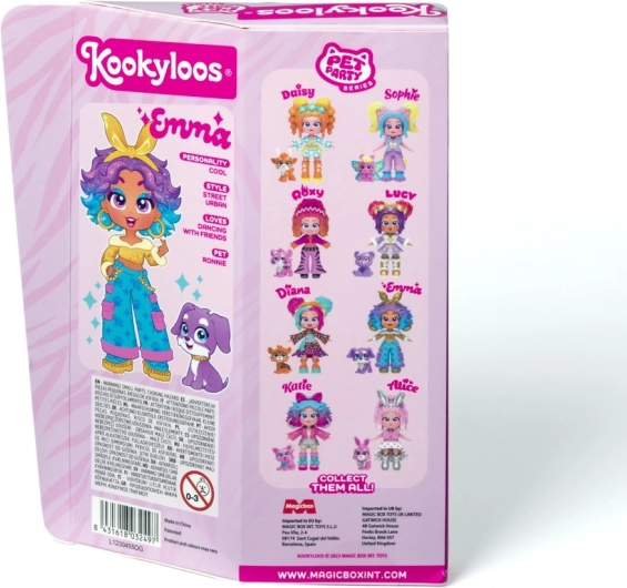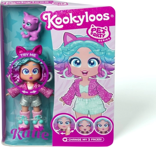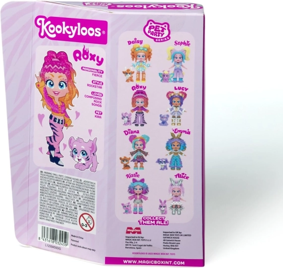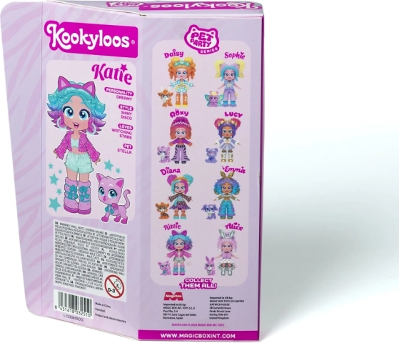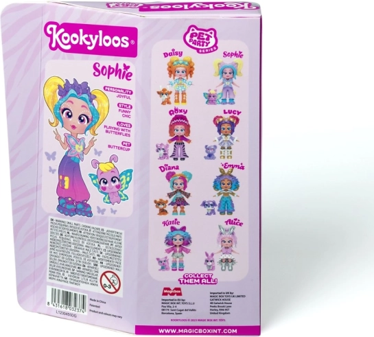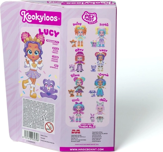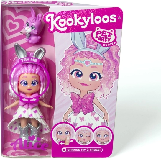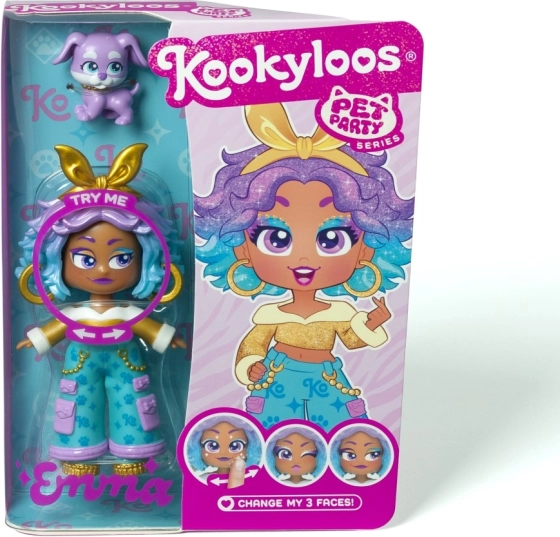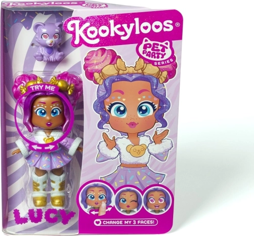 Mød Lucy, Sophie, Katie, Roxy, Alice, Daisy, Diana og Emma – stjernerne i serien KOOKYLOOS Pet Party. Hver dukke kommer med sin egen stil, et perlemorsskinnende outfit og et lille kæledyr, der understreger hendes personlighed. Takket være den smarte mekanisme er ét klik nok til at skifte ansigtsudtryk – en leg, der aldrig bliver kedelig.