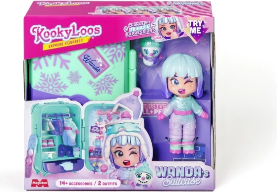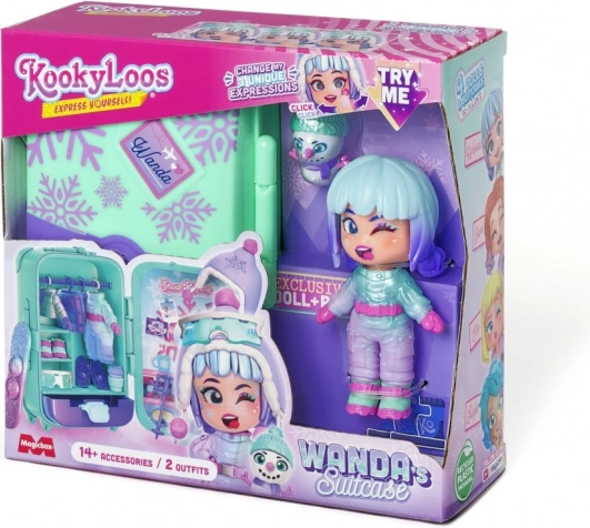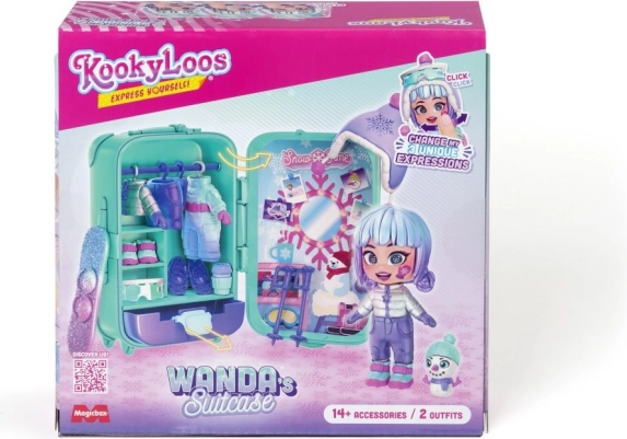 Tag på eventyr med dukken KookyLoos Wanda i en praktisk kuffert! Der venter dig 2 stilfulde vinteroutfits, mere end 13 accessories og et ansigtsudtryk, der kan skiftes med ét klik. Alt kan nemt pakkes i den rejsevenlige kuffert, så du kan lege hvor som helst.