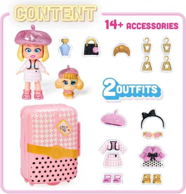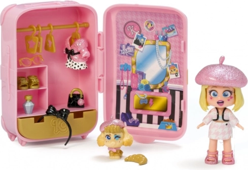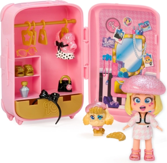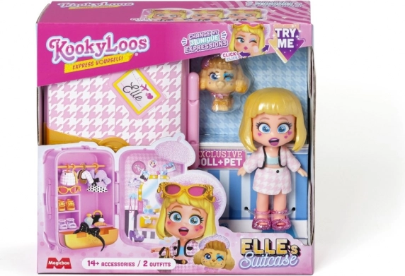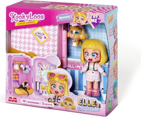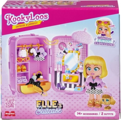 Er du klar til at tage af sted? KookyLoos-kufferten indeholder alt, hvad du behøver for at have det sjovt. Der venter op til 4 modeller at samle på! Elle er en ægte modekender. Hendes haute couture-outfits er den nyeste parisiske modestil! Er du klar til en rundtur i juvelerbutikkerne på Place Vendôme og Rue Chambon? Men det er dig, der bestemmer, hvilket af de to outfits hun skal have på til den nyeste modeopvisning! Hun har også tre forskellige ansigter, som du kan skifte med ét klik. Du kan pakke alting ned i kufferten og tage det med dig! Kufferten indeholder – en eksklusiv KookyLoos-dukke, 2× outfit, 1× kæledyr, mere end 13 accessories og bøjler.