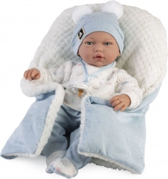 Realistisk babydukke med blødt stofkrop, der let kan justeres. Arme og ben er fastgjort med led, som gør det muligt for dukken at sidde. Leveres med sut som tilbehør.