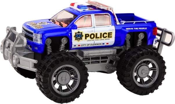 Bilen har optræk/drive, så efter at de bageste hjul drejes, kører bilen selv af sted. Takket være det samlede design og detaljerne minder legetøjet om en ægte terrængående politibil, som helt sikkert vil glæde små bil- og politientusiaster.
