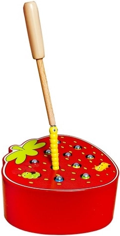 Et sjovt trælegetøj formet som et jordbær, hvor børn med en magnetisk pinde fanger farverige orme skjult i hullerne og sætter dem i igen. Støtter finmotorik, hånd-øje-koordination og koncentration. Sikker udførelse i kvalitetstræ og livlige farver indbyder til gentagen leg.