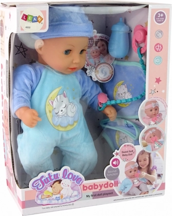 Den søde babydukke er klædt i en fin blå pyjamas med motiv af en sovende kat og har en lille hue på hovedet. Sættet inkluderer også en lyserød sut og en drikkeflaske. Tilbehøret omfatter desuden hagesmæk og trusser. Det samlede look er velafstemt og meget charmerende.