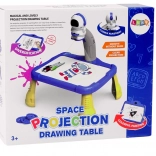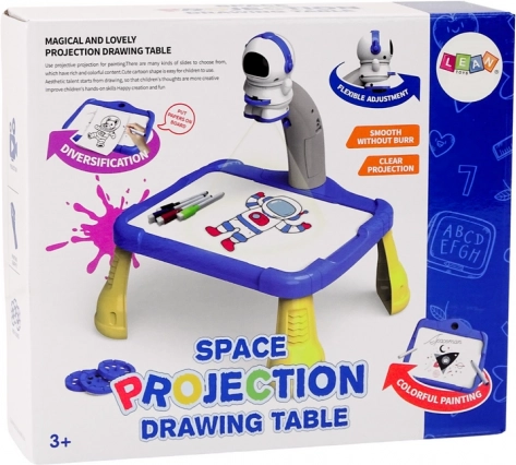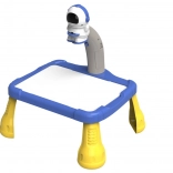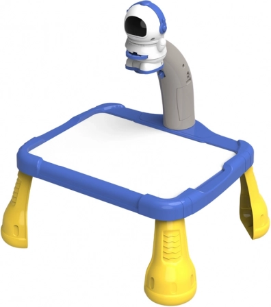 Projektoren er formet som en astronaut og bruges til at projicere billeder på papir, så børn nemt kan følge og tegne rumtemaer som planeter, stjerner, raketter og astronauter. Bordet har stabile gule ben og en rummelig blå tegneflade.
