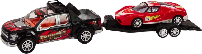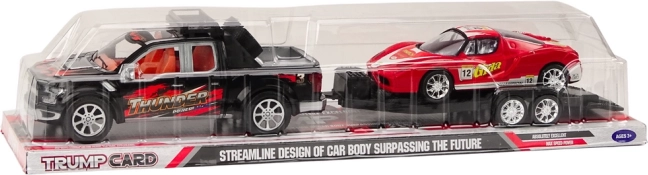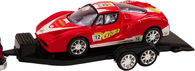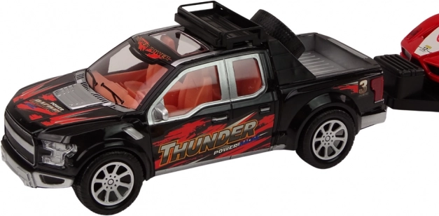 Pickuppen med store sorte hjul trækker sikkert traileren med sportsvognen, og takket være friktionsmotoren kører den frem uden batterier efter optrek. Den aftagelige trailer gør det nemt at skifte leg – børn kan transportere bilen eller lege med hver model for sig. Den røde sportsvogn imponerer med elegante linjer og kan let lastes og aflæsses.