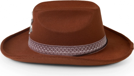 Stilfuld cowboyhat til børn i brun med en sherifstjerne og en behagelig elastik under hagen – det perfekte tilbehør til karneval og vilde westernlege.