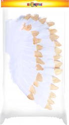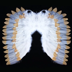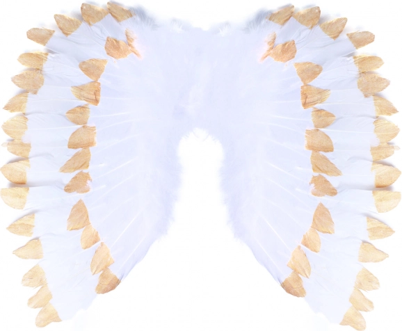Giv din udklædning et himmelsk skær. Disse hvid‑guld englevinger med bløde fjer og glitrende dekoration skaber et iøjnefaldende look, der skiller sig ud ved enhver lejlighed – fra skolearrangementer til juleevents.
