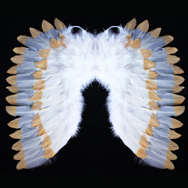 Elegante englevinger med sne-hvide fjer og gyldent glimmer, der perfekt fuldender et engelkostume. Med mål på ca. 67 × 46 cm giver de en markant effekt og behagelig pasform til fastelavn, Sankt Nikolaus og temafester.