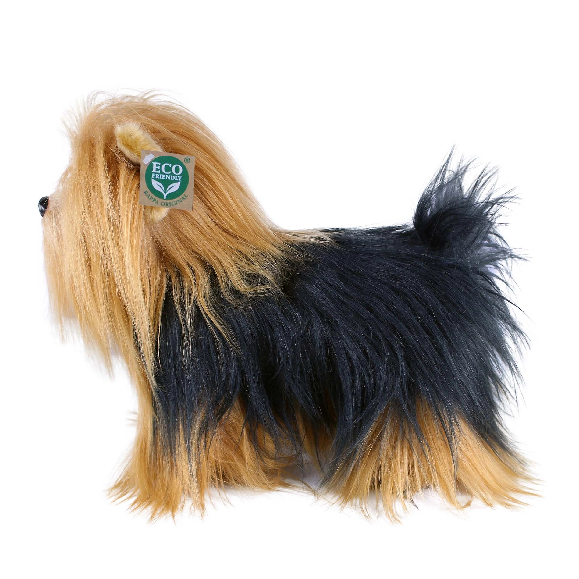 Sød plys Yorkshire terrier i størrelsen 30 cm fra den eksklusive RAPPA-kollektion glæder både børn og hundeelskere. Legetøjet er fremstillet af meget kvalitetsrig, blød plysfleece, og dets fyld af genanvendte PET-flasker er sikkert og skånsomt for miljøet. Det realistiske design med lang, silkeblød pels og solidt håndværk gør den til både en skøn krammebamse og en fin dekoration til børneværelset.