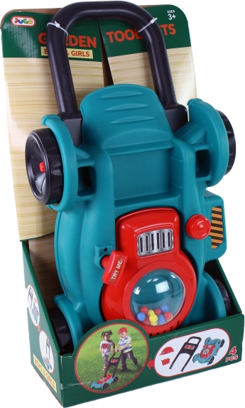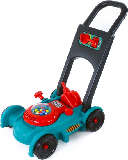 Plæneklipperen har en turkis base og et rødt håndtag, som giver legetøjet et muntert og tiltalende udseende.
