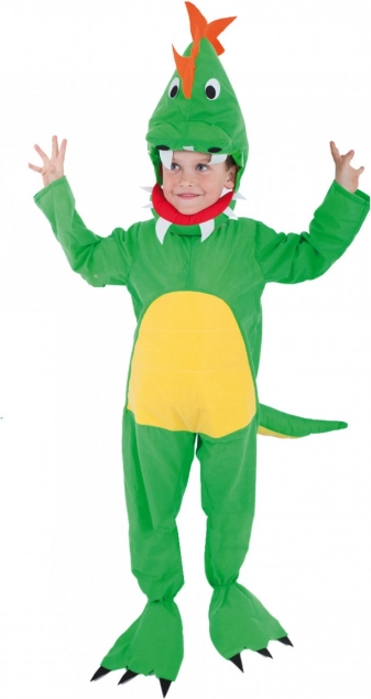 Det søde og fantasifulde børnekostume som dinosaur giver timevis af sjov til udklædning og temafester. Heldragten med markant hale kompletteres af en aftagelig hætte formet som et dinosaurhoved med åben mund for et endnu mere realistisk udtryk. Kostumet er designet til børn i alderen 4–6 år (105–116 cm).