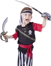 Karnevalskostume til en ægte pirat! Kostumet i størrelse M er beregnet til drenge i alderen 6-8 år (116-128 cm). Bemærk, pakken indeholder bælte, overdel, bukser og tørklæde! Ikke kun i år skal vi tænke både ØKO-nomisk og ØKO-logisk! ØKO-emballage er især velegnet til webshops, hvor kunden køber ud fra foto, og der er ikke behov for stor emballage med bøjle. ØKO-logisk – der er brugt mindre plast og andre materialer til emballagen. Det er en lille transparent pose med foto. ØKO-nomisk – ØKO-emballagen optager kun halvt så meget plads – spar lagerplads med os!