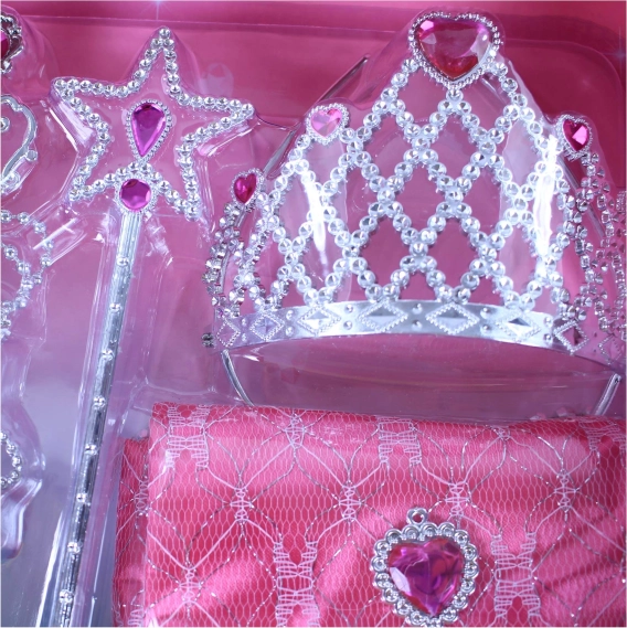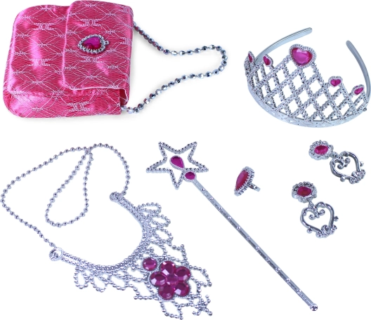 Pakkens indhold: krone, øreringe, halskæde, tryllestav, håndtaske.