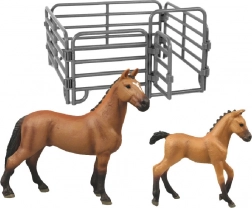 Ideelt sæt til hesteelskere indeholder en figur af en hest og en føl i en imponerende brun farve med en hvid plet, suppleret med en indhegning.