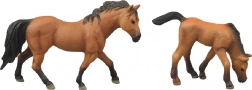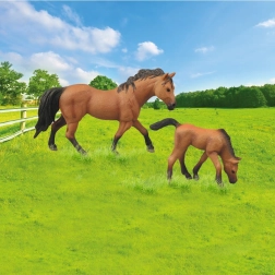 Dette sæt inkluderer to plastikheste - en voksen hest og et føl, ideelt til uddannelsesmæssige og dekorative formål.