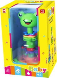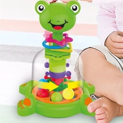 Denne frøkarrusel med kugler er en ideel første interaktiv legeting for de mindste. Ved et enkelt tryk på frøens hoved starter rotationen, kuglerne snurrer rundt, hopper og skaber en sjov rasleeffekt, som stimulerer både syn og hørelse.