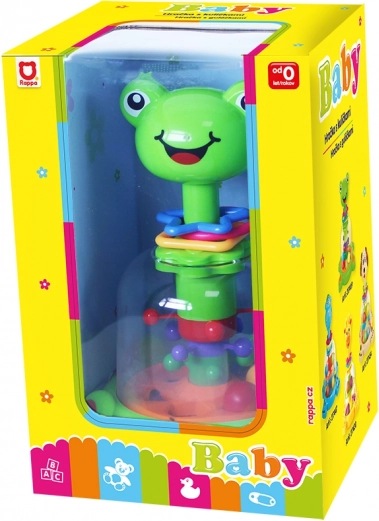Den farverige mekaniske karrusel formet som en frø fanger børns opmærksomhed ved første blik – når man trykker på hovedet, roterer og hopper kuglerne og laver en raslende lyd. Legetøjet fungerer uden batterier og tiltaler selv de mindste børn.