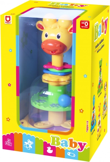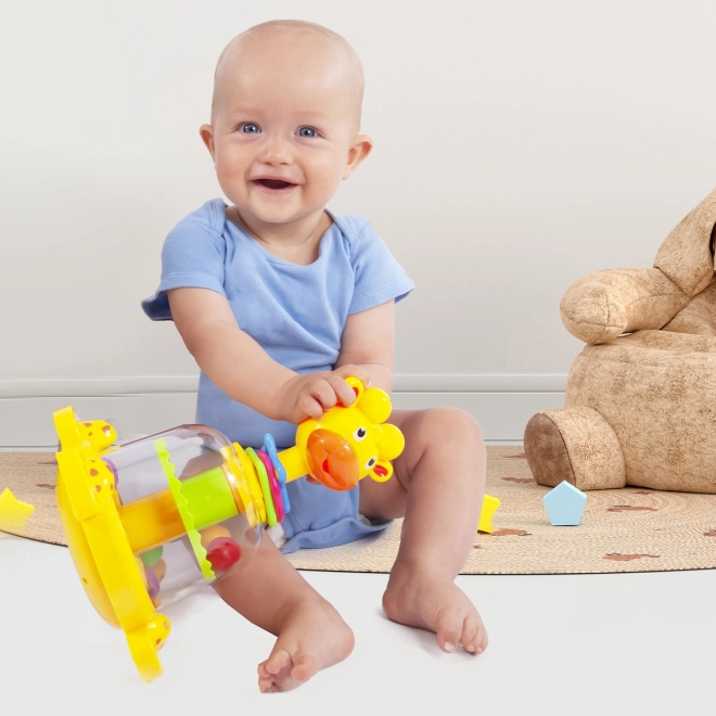 En farverig karrusel i form af en giraf underholder selv de mindste: når man trykker på hovedet, begynder de farvede kugler at snurre, hoppe og lave en raslende lyd. Enkel mekanisk betjening uden batterier understøtter finmotorik og hånd-øje-koordination.