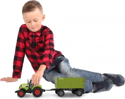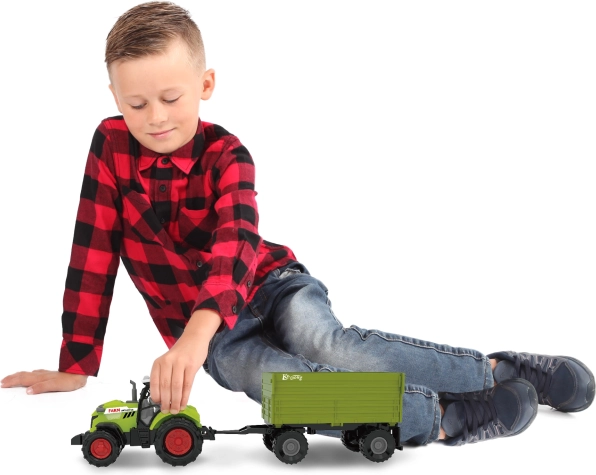Oplev realistisk gårdleg med en kompakt traktor med anhænger, som er ideel til små børnehænder. Anhængeren kan nemt afmonteres og åbnes, så transport af “last” er en leg. Takket være friløb er traktoren let at styre og kører glat på plane overflader.