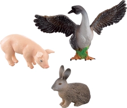 Indeholder tre realistiske plastikfigurer: et pattegris, en kanin og en gås med udbredte vinger, fremstillet i naturlige farver.