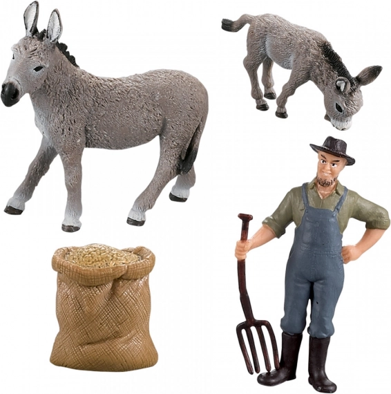 Oplev gårdens verden med detaljerede figurer. To æsler i naturlige farver og en landmand med høtyv inspirerer børn til at fortælle historier, lave små scener og udforske livet på landet.
