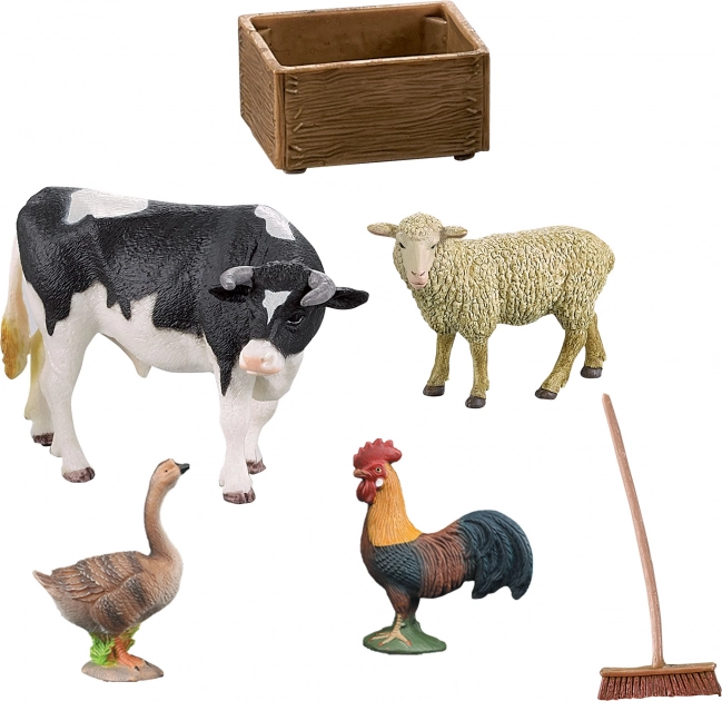 Oplev landlivets charme med et sæt, der bringer en ko, et får, en gås, en hane og en bonde i detaljeret udførelse. Børn skaber let deres egen gård, fodrer dyrene ved truget og gør gårdspladsen ren med kosten, mens de udvikler fantasi og finmotorik.