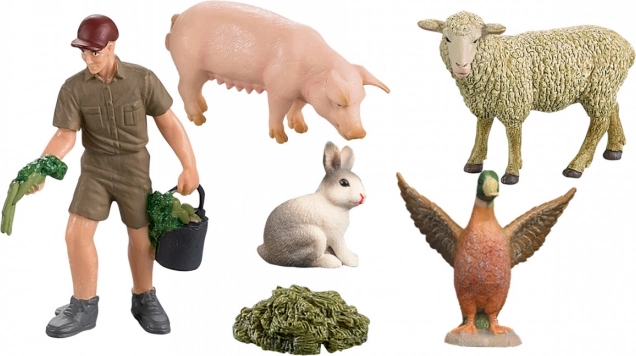 Bonden, det lille svin, fåret, anden og haren – alt hvad børn behøver til rolleleg på gården. Foder medfølger og giver endnu flere legescenarier.