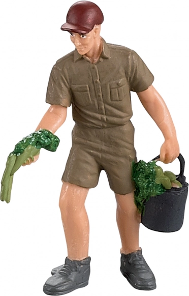 Den detaljerede bondefigur holder en spand og grøntsager for at fodre dyrene og tage sig af dem.