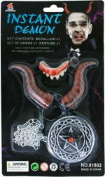 Dette komplette sæt af djævelske accessories forvandler ethvert outfit på et øjeblik. Komfortable horn på elastik sidder godt, den markante halskæde med pentagram fuldender et mystisk look, og realistiske vampyrtænder giver kostumet et mørkt glimt.