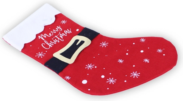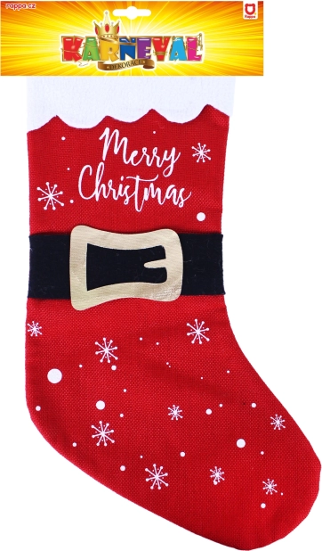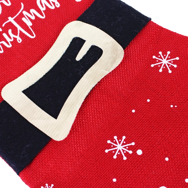 Denne julestrømpe er det ideelle valg til at pynte dit hjem i højtiden, fyldt med hygge og glæde. Den er lavet af kvalitetsstof, som er blødt at røre ved og samtidig robust nok til at rumme små gaver og søde sager. Designet fremkalder Julemandens frakke med sort bælte og gylden spænde. Smukke hvide snefnug og teksten 'Merry Christmas' tilfører en festlig atmosfære til helhedsindtrykket.