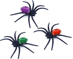 Små gummiedderkopper, som er en fantastisk dekoration til en Halloweenfest! Pakken indeholder 6 farvede, glitrende edderkopper.