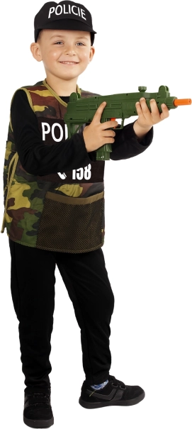 Dette realistiske politibetjentkostume er perfekt til fastelavn, maskebal og leg derhjemme. Den lette sorte heldragt, camouflagevesten med den tydelige tekst POLICIE og kasketten giver et autentisk look og komfort hele dagen.