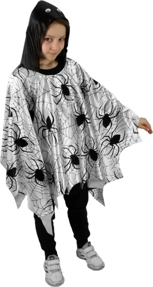 Leder du efter et nemt og effektfuldt kostume til børn? Denne lette kappe/poncho med sort print af edderkopper og spindelvæv på hvid baggrund fanger opmærksomheden med det samme. Takket være den løse pasform tages den nemt over hovedet og giver ubegrænset bevægelse ved leg, dans og optog.