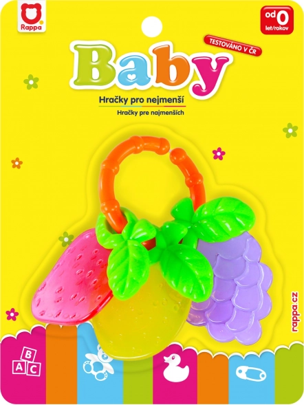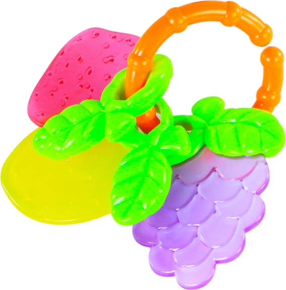 Den legende rangle/bidering med frugtmotiver fanger barnets opmærksomhed med klare farver og en behagelig tekstur, der masserer gummerne og hjælper under tandfrembrud. Den praktiske form understøtter naturligt greb og udviklingen af finmotorikken.