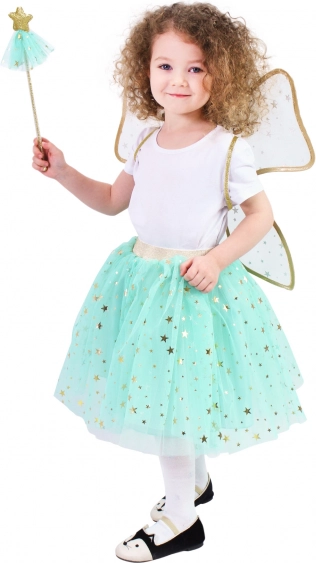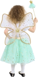 Kostumet indeholder en smuk grøn skørt med gyldne stjerner, suppleret med matchende vinger og stav for en perfekt eventyroplevelse.