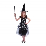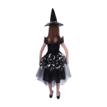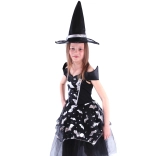 Dette smukke heksekostume med flagermusmotiver er det perfekte valg til piger i alderen 6-8 år med højde 117-128 cm. Den sorte kjole med luftig nederdel er pyntet med sølvdetaljer, og den matchende hat med en elegant sølvsløjfe fuldender looket.