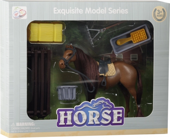 Denne sæt med en brun hest er ideel til børn, der elsker dyr og gårdleg. Hesten har en mørk man, sadel, og takket være den medfølgende børste kan børn passe den som en rigtig hest. Der medfølger også en sammenklappelig fold, som gør legen endnu mere autentisk.