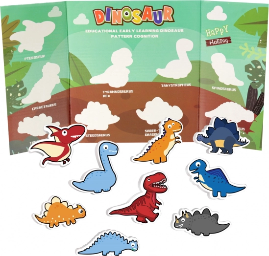 - Underlag, 9 dinosaur-udskæringer, 9 klistermærker, tilsvarende antal magneter