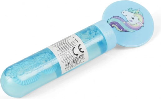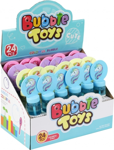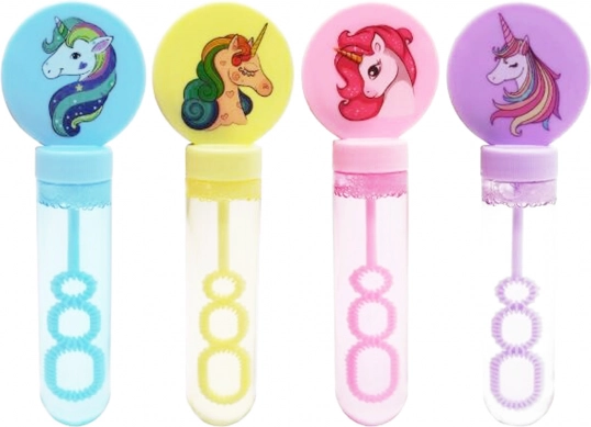 Farverige sæbebobler med billede af en enhjørning. Blæsepinden er en del af låget. Med dette sjove stykke legetøj får du garanteret masser af sjov! Dette produkt kan kun købes i hele pakninger á 24 stk.