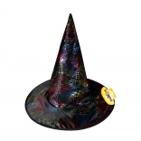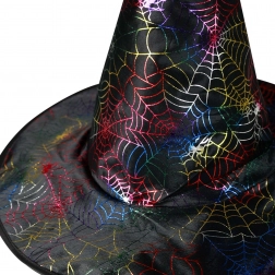 Et stilfuldt tilbehør, der straks fuldender dit hekse- eller troldmandskostume. Hatten med et markant edderkoppespind-mønster på sort baggrund tiltrækker opmærksomhed og giver et autentisk udtryk takket være den brede skygge og spidse form. Det lette tekstile materiale er behageligt at have på hele aftenen.