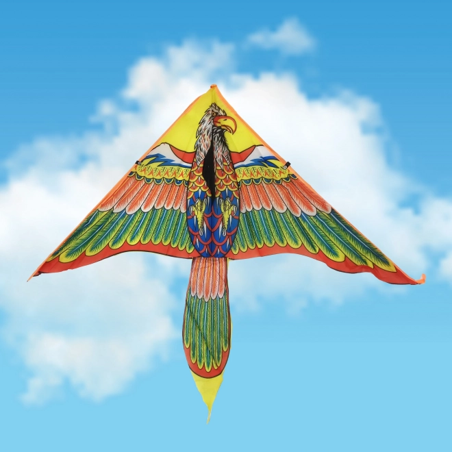 Farverig flyvende drage med ørnemotiv, vingefang ca. 110 cm. Let nylon, stabil flyvning, snor med håndtag medfølger. Ideel sjov til blæsende dage.